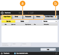 (Asetukset/Tallennus), niin <Asetukset/Tallennus>-näyttö avautuu. Paina ensin tätä painiketta, kun haluat tehdä muutoksia eri asetuksiin, kuten paperiasetuksiin, näyttöasetuksiin ja verkkoasetuksiin. Tässä ikkunassa voit myös tallentaa vastaanottajia, kuten sähköpostiosoitteita ja faksinumeroita.