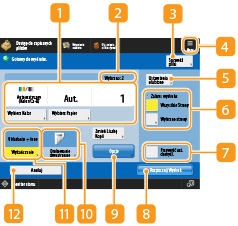 Wyświetla status ustawień, takich jak format papieru do zadrukowania oraz liczbę wydruków. Upewnij się, że potwierdzono ustawienia, aby rozpocząć prawidłowy proces drukowania. Aby zmienić ustawienia, należy nacisnąć na przycisk znajdujący się pod wyświetlaną sekcją. Aby zmienić liczbę wydruków, należy wprowadzić żądaną liczbę za pomocą klawiszy numerycznych.