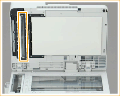 Essuyez la zone de numérisation des documents chargés du côté de la vitre d'exposition.
