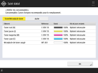 Vous pouvez vérifier la quantité restante de consommables à partir de l'interface utilisateur distante. Vérification du statut de la machine |
