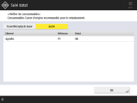 <Nb de jours restants> affiche le nombre attendu de jours restants avant qu'un remplacement ne soit nécessaire, en fonction de l'utilisation antérieure. Même si <Rplcmnt nécessaire> apparaît dans <Nb de jours restants>, ne procédez pas au remplacement tant qu'un message ne vous invite pas à remplacer les consommables dans la zone d'affichage de l'état (en bas de l'afficheur tactile). La mesure du <Nb de jours restants> ne s'effectue pas directement après le démarrage du fonctionnement de la machine, et le message <1 an ou plus> s'affiche pendant ce laps de temps. Le nombre de jours restants affiché après ce laps de temps peut être temporairement extrêmement petit. |