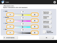 <Regolazione fine densità>Selezionare un colore e regolarne il livello di densità in base alla relativa area di densità usando il pulsante <-> o <+>. Al termine della regolazione, premere <OK>.
