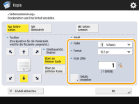 Kopiesatznummern werden auf alle kopierten Seiten gedruckt. Kopiensatznummern können zusammen mit Datum oder Text gedruckt werden. <Einstell. Option Kopiensatznummerierung> Der Text für <Seitennummerierung> und <Wasserzeichen> kann auch aus dem in <Zeichen für Seitennum./Wasserz. speichern> eingetragenen Text ausgewählt werden. Wenn Sie zwei der Optionen <Seitennummerierung>, <Wasserzeichen>, <Druckdatum> oder <Kopiensatznummerierung> auf dieselbe Druckposition einstellen, erscheint nach dem Drücken von (Start) eine Meldung, in der Sie gefragt werden, ob mit diesen Einstellungen gedruckt werden soll.Wenn Sie <Einstell. Option Kopiensatznummerierung> auf <Ein> einstellen, können Sie die Einstellungen wie folgt ändern. <Einstell. Option Kopiensatznummerierung> Im Modus für die Nummerierung von Kopiersätzen können Sie <Vollfläche> und <Ziffern an 5 Positionen> nicht mehr für die Druckpositionen wählen. Die Zahlengrößen im Modus für die Nummerierung von Kopiersätzen werden zu <10,5 pt>, <12,0 pt>, und <14,0 pt>. |
