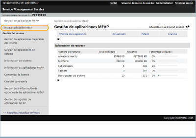 Puede consultar el número de aplicaciones instaladas y el espacio utilizado en el dispositivo de almacenamiento. Gestionar aplicaciones MEAP