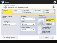 Al copiar documentos que incluyen información confidencial, puede integrar texto invisible, tal como "TOP SECRET" o "CONFIDENCIAL" para avisar a los usuarios no autorizados de que no deben copiarlos. Al copiar un documento que ya se ha copiado, el texto integrado aparece en toda la página para evitar copias no autorizadas de copias. Opciones del sistema