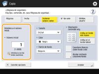 Pulse <Opciones> en la pantalla de Funciones básicas de copia. Pantalla de funciones básicas de copia