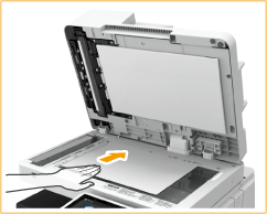 Alinee la esquina del original con la esquina superior izquierda del cristal de copia, y coloque el original de modo que la parte superior e inferior queden bien posicionadas, tal como se muestra en las ilustraciones siguientes.