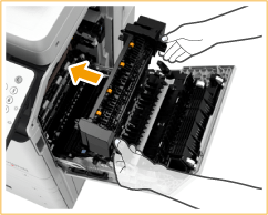 ![]() | Abra la guía de la unidad de fijación. Si hay papel atascado, sáquelo suavemente tirando en el sentido de la flecha. ![]() ![]() Si el papel queda parcialmente fuera de la parte inferior (lado de entrada) de la unidad de fijación, tire con cuidado del papel hacia abajo. |