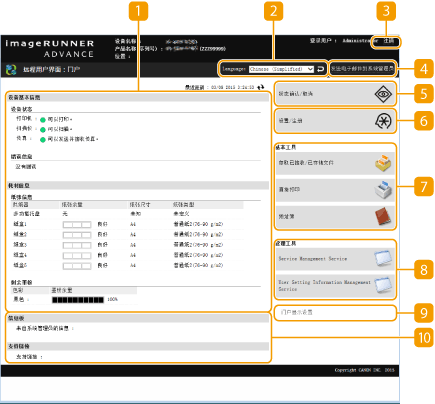 登录到“远程用户界面”时,将显示如下所示的门户页面。本节介绍门户页面上显示的项目及基本操作。