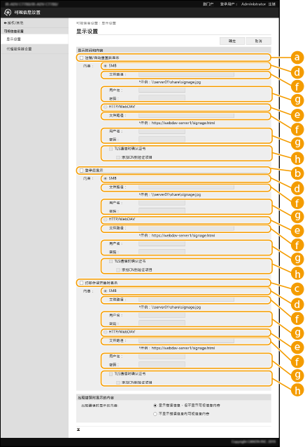 如果设置了可视信息功能,则无论时间为何,都可随时从主页上的<可视信息>中检查内容。将显示上次显示的内容。 将文件服务器或同一个网络上高级存储箱中保存的文件设置为要显示的内容。作为简单的文件服务器使用 您也可以通过代理服务器将互联网网站设置为内容。此功能所使用的代理设置与<代理服务器设置>中的设置相同。 如果设置了代理服务器,可能不会显示指定的内容。如果发生这种情况,请设置例外地址,以便不使用代理服务器。设置未使用代理服务器时的例外地址 如果启用了“强制保留打印”功能并且选中[打印作业开始时显示]复选框,则显示内容。 |