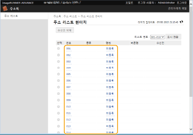 2 | [미등록] 또는 미등록 원터치 번호를 클릭합니다. 미등록 원터치 버튼에 대한 [미등록]이 [명칭]에 표시됩니다. 목록에 나와있지 않은 원터치 버튼을 표시하려면 [리스트 번호]에서 번호 범위를 선택한 후 [표시 전환]를 클릭합니다. ![]() |