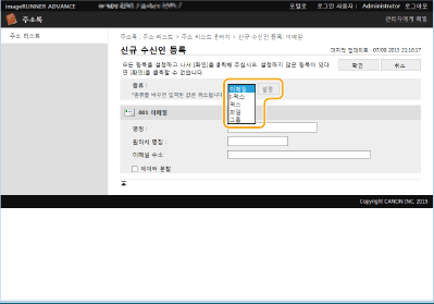 4 | 필요한 정보를 등록하고 [확인]를 클릭합니다. 표시되는 항목은 수신인 유형에 따라 달라집니다. 등록할 정보에 대한 자세한 정보는 주소록에 수신인 등록를 참고하십시오. |