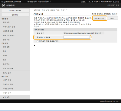내보내기 한 설정 데이터를 가져오기할 때 [암호화 비밀번호]에 입력한 비밀번호를 입력해야 합니다. 영숫자 문자를 사용하십시오.
