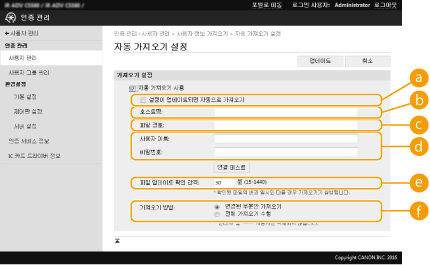 Canon 기기에서 내보낸 사용자 정보를 고급 박스 사용자 액세스 제어를 통해 가져옵니다. 파일 확장자는 "csv"입니다.