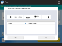 If you select <On> for both <Display Confirmation Screen When Recalling> and <Start Operation for Recall (Operation starts when button is pressed.)>, copying starts after you select <Yes> on the confirmation screen.