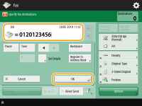 To check the total number of specified destinationsThe total number of specified destinations is displayed on the top right of the screen. This enables you to confirm that the number of destinations is correct before sending. ![]() To send with the sender informationYou can send with the sender's name and fax number. <TX Terminal ID> To check the statuses for sent documentsOn the <Status Monitor> screen, you can check the statuses for sent documents. This screen enables you to send faxes again or cancel sending after checking the statuses. Checking Status and Log for Sent and Received Documents When <Display Notification When Job Is Accepted> is set to <On>, the <Status Monitor> screen can be displayed from the following screen that is shown after a send job is received. <Display Notification When Job Is Accepted> ![]() When a transmission error occurs because the recipient's line is busyThe machine automatically redials after a certain period of time. You can change the settings such as how many times the machine redials and the interval between redials. <Auto Redial> To print the report for the results of sendingOn the Fax Basic Features screen, pressing <Options> <TX Report> enables you to set to automatically print the report listing the results of sending.To set this for each job from <Options>, it is necessary to select <For Error Only> or <Off> in <TX Report>, and then set <Allow Printing from Options> to <On>. When multiple sheets are fedScanning is stopped and the message is displayed on the screen. Follow the instructions to clear the jam. When you have cleared the jam, the resume job screen is displayed. If the machine mistakenly detects multiple sheet feeding, press <Do Not Detect Multi. Sheet Feed> to resume scanning. To set the machine in advance to not notify you of multiple sheet feeding, perform one of the following operations. Each time you send, press <Options> on the Fax Basic Features screen select <Detect Feeder Multi Sheet Fd.> to disable the setting. Set <Set Detection of Feeder Multi. Sheet Feed as Default> to <Off>. <Set Detection of Feeder Multi. Sheet Feed as Default> When photos in the sent image are too dark or light colors in the background of color originals cannot be removedThe quality of the sent image may be able to be improved if the following conditions/settings are met. Job type: Fax (Memory Sending) or Scan and Send (Fax/I-fax) <Select Color>: <Black & White> (Scan and Send) <Original Type>: <Text> <Density> <Background Density>: <Auto><Resolution>: 200 dpi x 400 dpi, 300 dpi x 300 dpi*, 400 dpi x 400 dpi, or 600 dpi x 600 dpi* *Can be set for Scan and Send <Speed/Image Quality Priority for B&W Scan> Fax/I-Fax Send Jobs: <Quality Priority> (<Speed/Image Quality Priority for B&W Scan>)When multiple telephone lines are setYou can select the telephone line to use for sending faxes by pressing <Options> <Select Line>. For instructions on specifying fax line settings, see Fax Line Settings. |