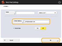 2 | Select <On> or <Off> in <Divide Data>. If the size of the data being sent exceeds the maximum limit (<Maximum Data Size for Sending>), select whether you want to divide the data by size or by page. If you select <On>, the data is divided into smaller sizes that do not exceed the limit and is sent in several sections. The recipient's e-mail software must be able to combine the data received. If you select <Off>, the number of pages to be sent at one time decreases and the total transmission is divided into several sections. For example, 10 pages of data are transmitted twice, 5 pages each time. Therefore, your counterpart receives two e-mails. However, if you send data that cannot be separated into pages, such as JPEG, a transmission error occurs. ![]() When the domain to use is fixed, you can skip domain entry. You can register a domain name to <Auto Add Specified Domain to Dest. Without Domain> and enable <When Sending E-Mail> in advance to automatically add a domain when sending, without the need to enter "@" and the domain name. You can register frequently used domain names in <Registered Characters> on the keyboard, and you can recall them when entering an e-mail address. <Registered Characters for Keyboard> |
