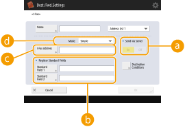 1 | Specify settings as necessary. ![]() <Send via Server>Specify whether or not to send I-faxes to destinations via the mail server. Select <On> if you want to send I-faxes via the mail server. Select <Off> if you want to send data directly to a recipient on the same local area network (LAN). By sending directly to a recipient, you can send large amounts of data without placing a burden on the mail server. ![]() To send an I-fax that is not in an IP address format such as "user name@[the recipient's IP address]" without using a mail server, settings such as an MX (Mail eXchange) record need to be configured on the DNS server. Ask your Network administrator whether or not this type of setting is available. When you set <Off> in <Send via Server>, you are required to set <On> in <Use Send via Server> in advance. If this setting is <Off>, the setting in <Send via Server> cannot be changed. It is recommended to set <Allow MDN Not via Server> to <On>. Even if you set <Send via Server> to <Off>, delivery confirmation of documents sent using the Full mode is carried out via the server. <Register Standard Fields>This setting is required for using an Internet fax service. If you do not use an Internet fax service, this setting is not necessary. For more information, contact your Internet service provider. <I-Fax Address>Enter the I-fax address using the following format: adv01@example.com. When sending to a recipient on the same network, use the following format: adv01@[192.168.11.100] (the recipient device name@[IP address]). When the domain to use is fixed, you can skip domain entry. You can register a domain name to <Auto Add Specified Domain to Dest. Without Domain> and enable <When Sending I-Fax> in advance to automatically add a domain when sending, without the need to enter "@" and the domain name. You can register frequently used domain names in <Registered Characters> on the keyboard, and you can recall them when entering an I-fax address. <Registered Characters for Keyboard> <Mode:>You can select the type of sending results that are displayed when (Status Monitor) is pressed. Select <Full> if you want to check whether an I-fax is delivered to the recipient's machine, or select <Simple> if you want to check whether an I-fax is delivered to a mail server. Note that you cannot confirm the delivery status if the recipient's machine does not support the <Mode:> function.![]() If you send an I-fax using the <Full> mode to a machine that does not support the <Full> mode, <Awaiting result...> is displayed when you press (Status Monitor) to check the delivery status, even if the transmission is complete. It continues to be displayed until the time set in <Full Mode TX Timeout> passes.You can check the delivery status by pressing (Status Monitor) <Send> <Job Log>. If the document was sent successfully, <OK> will be displayed, if it failed to send, <NG> will be displayed, and if the results cannot be confirmed, <--> will be displayed. In the Simple mode, even if the delivery was successful, <--> will be displayed because delivery confirmation cannot be carried out. | |
