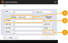 1 | Enter the host name of the file server/Advanced Box which transmits data. ![]() Ask your Network administrator about the information on the file server/Advanced Box. <Protocol>Select a protocol for the file server from <Windows (SMB)>, <FTP> and <WebDAV>. When sending a document to the Advanced Box, select <Windows (SMB)> or <WebDAV>. ![]() If you select <Windows (SMB)>, the <Search Host> and <Browse> buttons are displayed. You can easily specify a file server/Advanced Box by searching or viewing the network. You can only use <Browse> if <1.0> is set to <On>in <Specify SMB Client Version>. You can register up to five Directory servers used in <Browse>. <Host Name>Enter the host name of the file server/Advanced Box. If you select <FTP> for the protocol, enter <Host Name> as follows. When TLS is disabled Example: To save to the Shared Space: ftp://host name/share To save to the Personal Space: ftp://host name/users When TLS is enabled Example: To save to the Shared Space: ftps://host name/share To save to the Personal Space: ftps://host name/users When sending a document to the Advanced Box, enter <Host Name> as follows. If you select <Windows (SMB)> for the protocol Example: To save to the Shared Space: \\192.168.100.50\share To save to the Personal Space: \\192.168.100.50\users If you select <WebDAV> for protocol When TLS is disabled Example: To save to the Shared Space: http://<IP address or host name> To save to the Personal Space: http://<IP address or host name> When TLS is enabled Example: To save to the Shared Space: https://<IP address or host name> To save to the Personal Space: https://<IP address or host name> <Check Connection>Press this button after entering the host name to confirm the connection with the file server/Advanced Box. ![]() If you are using a login service such as personal authentication management, it is necessary to enter <User Name> and <Password>. |