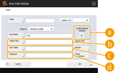 2 | Configure the file server/Advanced Box information. ![]() Ask your Network administrator about the file server/Advanced Box information and the folder. <Confirm Before Sending>By enabling <Confirm Before Sending>, a screen requiring password entry is displayed before sending, even if a password is entered in ( ). <Folder Path>Specify the folder's directory to which data is sent. When sending a document to the Advanced Box with <WebDAV> selected for the protocol, enter <Folder Path> as follows. Example: To save to the Shared Space: /share To save to the Personal Space: /users <User Name>Enter the login user name of the file server/Advanced Box. <Password>Enter the login password of the file server/Advanced Box. ![]() When the file server/Advanced Box destination is included in the group (Registering Multiple Destinations as a Group), clear the check box in . If the check box is selected, you cannot send data.If you specify the destination for which you activate <Confirm Before Sending> as the forwarding destination, the screen to enter the password does not appear. The registered password is used and forwarding is performed. You can use different authentication information from the user name in ( ) and password in ( ) to register to the address book. For more information, see <Information Used for File TX/Browsing Authentication>.If you set <Protocol> to <Windows (SMB)> or <FTP>, specifying a folder that does not exist in <Folder Path> will result in the folder being automatically created and files being stored within. However, a sending error will occur if you specify a folder with multiple levels. When checking a WebDAV connection, the HEAD method of HTTP is used to check the connection. The folder specified in <Folder Path> is accessed using the HEAD method. If access via the HEAD method is prohibited for the corresponding folder, an error occurs for the connection check. Examples of settings that prohibit access via the HEAD method are indicated below. IIS7: Access cannot be performed via the HEAD method unless [Source] is selected in the access permissions for the WebDAV authoring rules of the target folder. Apache: Access cannot be performed via the HEAD method unless HEAD is described using the [Limit] directive in httpd.conf. Advanced Box WebDAV server: Access via the HEAD method is always prohibited. |