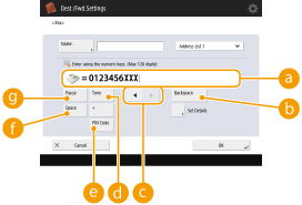 Fax number fieldEnter the fax number using the numeric keys. Enter to as necessary. <Backspace> Delete numbers to the left of the cursor in the fax number field ( ) one by one.![]() /![]() Press when moving the fax number field cursor ( ) to the left or right. <Tone>If you press this button, the character "T" (tone) is inserted. Even if you are using pulse dial, numbers following "T" will be sent using tone dial. <PIN Code>Press to enter the PIN (Personal Identification Number) code. <PIN Code Access> (for the 120 V machine only) <R> keyIf the machine is connected to a PBX (Private Branch Exchange), press this button before entering the destination. If this button is not available, you need to register the R-key settings. <R-Key Setting> (for the 230 V machine only) <Space>Enter a blank space between numbers to make them easier to read. <Pause>If you press this button, the character "P" (pause) is inserted. When sending a fax overseas, insert pauses after the international access code or fax number. This helps to improve the connection. ![]() You cannot insert a pause at the beginning of a number. <PIN Code> or <R> is displayed, depending on the model of your machine or the region. | ||