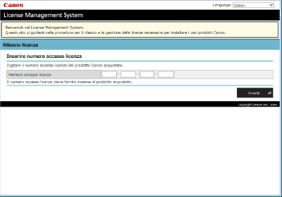 Aprire un browser Web per accedere a http://www.canon.com/lms/license/