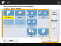 Il numero delle voci di impostazione nella schermata Funzioni di base e la posizione di visualizzazione variano in base alle funzioni. Non viene visualizzato alcun pulsante di scelta rapida se <Non assegnato> è impostato come scelta rapida. Il limite per il numero di scelte rapide per <Opzioni> registrabili è il seguente. Copia: 5 Fax: 4 Scansione e invio: 2 |