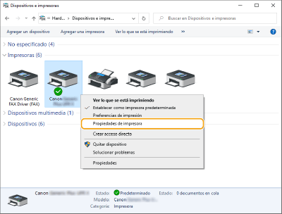 Haga clic con el botón derecho del ratón en el icono de impresora del equipo y haga clic en [Propiedades de impresora].