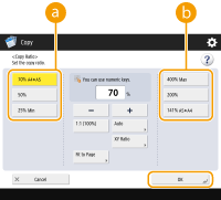 ![]() | Puede ampliar o reducir especificando la escala de copia (%). Puede especificar la escala vertical y horizontal por separado. Ampliar o reducir copias especificando la escala de copia | |