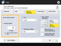 Al copiar documentos que incluyen información confidencial, puede integrar texto invisible, tal como "TOP SECRET" o "CONFIDENCIAL" para avisar a los usuarios no autorizados de que no deben copiarlos. Al copiar un documento que ya se ha copiado, el texto integrado aparece en toda la página para evitar copias no autorizadas de copias. Opciones del sistema
