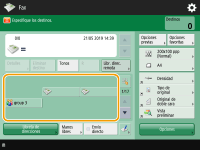 Guardar una copia de un documento enviadoPuede configurar el equipo para que se guarde automáticamente una copia de un documento enviado en un servidor de archivos. La copia se convierte en un archivo electrónico, como un PDF, y se guarda, para que pueda comprobar fácilmente el contenido desde el ordenador. Guardar una copia de un documento enviado Seleccionar un nombre de remitenteEn la pantalla de funciones básicas de fax, al pulsar <Opciones> <Nombre de remitente (TTI)> puede seleccionar un nombre de una lista de nombres del remitente registrado para incluir en la información del remitente. <Guardar nombre de remitente (TTI)>Si se inicia sesión mediante la autenticación de usuario, el nombre de inicio de sesión aparece en <100> del nombre del remitente (TTI). Comprobar imágenes escaneadas antes de enviarPuede comprobar imágenes escaneadas en la pantalla de vista preliminar antes de enviar. Comprobar imágenes escaneadas antes de enviar (vista preliminar) Registrar opciones de uso frecuentePuede combinar destinos de uso frecuente y opciones de lectura en un botón del equipo para su uso posterior. Pulsando el botón registrado al escanear originales puede completar rápidamente sus opciones. Registrar una combinación de funciones de uso frecuente |