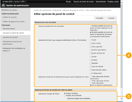 Puede configurar los métodos de inicio de sesión, los dispositivos de autenticación y otras funciones de autenticación a partir de su entorno de sistema y sus necesidades. También puede especificar cómo se muestra la pantalla de inicio de sesión.