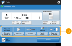 Los botones de opciones que aparecen en la pantalla de funciones básicas (de copia, fax y lectura) se pueden cambiar con otros botones de configuración en <Opciones>. Al situar los botones de opciones de uso frecuente en la pantalla de funciones básicas, puede utilizar las funciones de forma más eficiente. Además, al iniciar sesión con gestión de autenticación personal, puede mostrar una pantalla de funciones básicas personalizada para cada usuario.