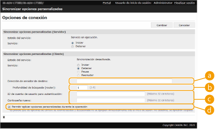 En los siguientes casos, se puede establecer la sincronización sin realizar el paso 5. Cuando los equipos que se van a sincronizar están en el mismo router. Cuando <Usar autenticación de usuario> está configurado como <Sí> en el equipo servidor (consulte <Usar autenticación de usuario>) y la autenticación de usuario está configurada como servicio de inicio de sesión (consulte Cambiar los servicios de inicio de sesión) Si no se introduce nada en [ID de cuenta de usuario para autenticación:] en los equipos cliente (el elemento es nulo). Cuando el servicio de sincronización de opciones personalizadas se inicia en el equipo servidor (si se trata de un equipo servidor/cliente, se puede modificar la configuración mediante el inicio del servicio del servidor y el servicio del cliente al mismo tiempo). Cuando hay solamente un equipo servidor para sincronizar las opciones personalizadas en la misma red El equipo cliente no puede conectarse mediante búsqueda en los casos siguientes. Introduzca la dirección IPv4 como dirección del servidor de destino. Si las opciones de red del equipo servidor incluyen IPv4 y IPv6, IPv6 tiene prioridad y en el equipo cliente se desactiva IPv6 Si se utiliza la línea principal para las opciones de red del equipo servidor y la línea secundaria se utiliza para las opciones de red del equipo cliente Si se utiliza la línea secundaria para las opciones de red del equipo servidor, especifique las opciones siguientes. Equipo servidor y cliente: introduzca la dirección IP de la línea principal o localhost como dirección del servidor de destino. Equipo cliente: introduzca la dirección IP de la línea secundaria del equipo servidor como dirección del servidor de destino. |