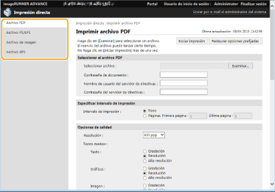 ![]() | Utilizando la IU remota, se pueden imprimir archivos guardados en un ordenador o red directamente desde el equipo sin utilizar el controlador de impresora. No tiene que abrir los archivos en el ordenador para imprimir. |