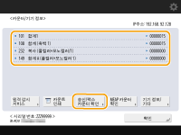이 화면에서 각 MEAP 애플리케이션의 카운터 정보를 확인할 수도 있습니다. 2단계의 화면에서 <MEAP 카운터 확인>을 누릅니다. 같은 화면에서 <기기 정보/기타> <디바이스 구성확인>을 누르면 기기에 설치된 옵션과 저장 장치 데이터 암호화에 사용되는 보안 칩 버전을 확인할 수 있습니다.