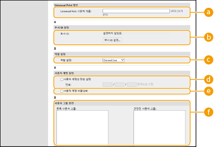 [사용자 그룹 관련]사용자를 그룹에 할당하려면, 목록에서 등록된 사용자 그룹을 선택하고 [추가]를 클릭합니다. 이 설정은 부서 ID를 사용자 그룹으로 사용하는 경우에는 표시되지 않습니다.