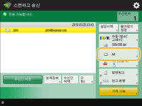 스캔 후 <원터치> 화면에서 수신인을 선택하려면 <기본화면 변경>에 대해 <원터치>를 설정하십시오. 스캔한 문서를 동일한 수신인에게 전송하는 데 필요한 작업을 줄일 수 있습니다. <기본화면 변경> 서버 기기의 원터치 버튼에 등록된 수신인은 다음과 같은 시점에 업데이트됩니다. 팩스 작업이 클라이언트 기기에 전송되었을 때 클라이언트 기기의 (Reset)을 눌렀을 때클라이언트 기기에 자동 리셋이 활성화되었을 때 |