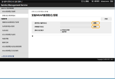 視 MEAP 應用程式而定,可從下列 URL 下載使用者手冊或相關軟體:http://canon.com/fau/downloads。 您可以使用如同安裝的相同程序升級 MEAP 應用程式版本。在安裝之前,請在 SMS 畫面上停止 MEAP 應用程式。管理 MEAP 應用程式 應用程式可使用的最大儲存裝置容量大約 4 GB。 |