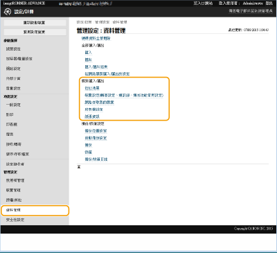1 | 按一下 [個別匯入/匯出] 中的 [裝置設定(轉寄設定、通訊錄、傳送功能常用設定)]。 |