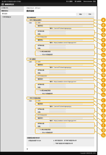 設定視覺訊息功能時,無論時間如何,都可以從首頁上的 <視覺訊息> 檢查內容。會顯示最後顯示的內容。 將位於相同網路的檔案伺服器或 進階郵件信箱 中儲存的檔案設為要顯示的內容。當作簡單的檔案伺服器使用 您也可以透過 Proxy 伺服器將網際網路上的網站設定為內容。此功能所用的 Proxy 設定與 <代理伺服器設定> 中的設定相同。 如果設定 Proxy,則指定的內容可能不會顯示。發生這種情況時,請設定例外位址,以便不使用 Proxy 伺服器。設定未使用代理伺服器時的例外位址 如果有啟用強制保留列印功能並勾選 [列印工作開始時顯示] 核取方塊,內容會在列印開始時顯示。 |