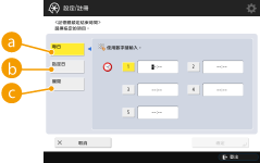 <記憶體鎖定結束時間> | <每日> (1 至 5)、<指定日> (<Sun> 至 <Sat>,1 至 5)、<關閉> | 是 | 否 | 是 | 是 | C | 設定/註冊基本資訊 |