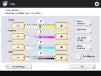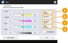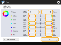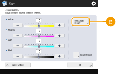 Select a color and adjust its density level by its density area using the <-> or <+> button. When adjustment is complete, press <OK>.
