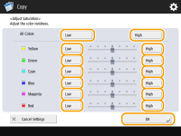 <Adjust Saturation>To set the saturation for all colors, use the <Low> or <High> button for <All Colors>. To set each color separately, use the <Low> or <High> button for each color. When adjustment is complete, press <OK>.