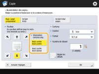Les numéros de jeux de copies sont imprimés sur toutes les pages copiées. Les numéros de jeux de copies peuvent être imprimés avec des dates ou du texte.<Régl. options numérot. jeux de copies> Le texte pour la <Numérotation des pages> et le <Filigrane> peut également être sélectionné à partir du texte qui a été enregistré dans <Enreg. caractères pour Num. pgs/Filigrane>. Si vous sélectionnez deux options parmi <Numérotation des pages>, <Filigrane>, <Date d'impression> et <Numérotation jeux copies> pour imprimer dans la même position, un message vous demandant si vous voulez imprimer avec ces réglages s'affiche lorsque vous appuyez sur (Démarrer).Si vous définissez <Régl. options numérot. jeux de copies> sur <Oui>, les réglages que vous pouvez modifier changent comme suit. <Régl. options numérot. jeux de copies> Vous ne pouvez plus sélectionner <Toute la surface> et <Numéros à 5 endroits> comme positions d'impression dans le mode Numérotation des jeux de copies. Les tailles de numéro du mode Numérotation des jeux de copies deviennent <10,5 pt>, <12,0 pt> et <14,0 pt>. |