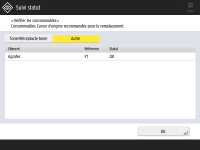 <Nb de jours restants> affiche le nombre attendu de jours restants avant qu'un remplacement ne soit nécessaire, en fonction de l'utilisation antérieure. Même si <Rplcmnt nécessaire> apparaît dans <Nb de jours restants>, ne procédez pas au remplacement tant qu'un message ne vous invite pas à remplacer les consommables dans la zone d'affichage de l'état (en bas de l'afficheur tactile). La mesure du <Nb de jours restants> ne s'effectue pas directement après le démarrage du fonctionnement de la machine, et le message <1 an ou plus> s'affiche pendant ce laps de temps. Le nombre de jours restants affiché après ce laps de temps peut être temporairement extrêmement petit. |