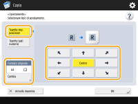 Se si desidera spostare l'immagine sul retro quando si copia fronte-retro, è necessaria l'impostazione <Retro>. Per spostare nella stessa posizione della fronte, premere <Come lato anteriore>. Per spostare in maniera simmetrica, premere <Opposto rispetto a lato anteriore>. Per spostare in una posizione diversa dalla fronte, premere <Imposta> ed immettere la distanza dello spostamento.