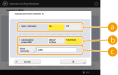 3 | Impostare la community. ![]() <Community dedicata>/<Nome community 1>/<Nome community 2>Per usare la community selezionata, premere <On>. Se non si vuole usare la community, premere <Off>. <Autorizzazione accesso MIB>Per ogni community, selezionare i privilegi di accesso MIB da <Lettura/Scrittura> o <Solo lettura>. <Nome community>Inserire un nome community a cui si appartiene usando i caratteri alfanumerici. Se si seleziona <Impostazione community dedicata>, non è possibile impostare un nome community esclusivo. |