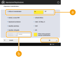 3 | Specificare le impostazioni necessarie e premere <OK>. ![]() <Utilizzo di Administrator>Se si usa l'amministratore, impostare su <On>. <Password crittografia>Se si usa una password diversa dall'autenticazione, deselezionare <Utilizzo stessa password usata per autenticazione>, premere <Password crittografia> e inserire la password. ![]() Se l'"Amministratore" è disabilitato, non sarà possibile impostare <Impostazioni Administrator> (l'impostazione di <Utilizzo di Administrator> è fissa su <Off>). |