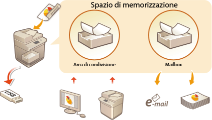 La periferica di memorizzazione installata in questa macchina presenta uno "spazio di memorizzazione" per salvare, condividere e modificare i documenti acquisiti. Se si collega il supporto di memoria alla macchina, è possibile avere uno spazio di memorizzazione esterno. Trovare e utilizzare lo spazio di memorizzazione ideale in base alle proprie esigenze.